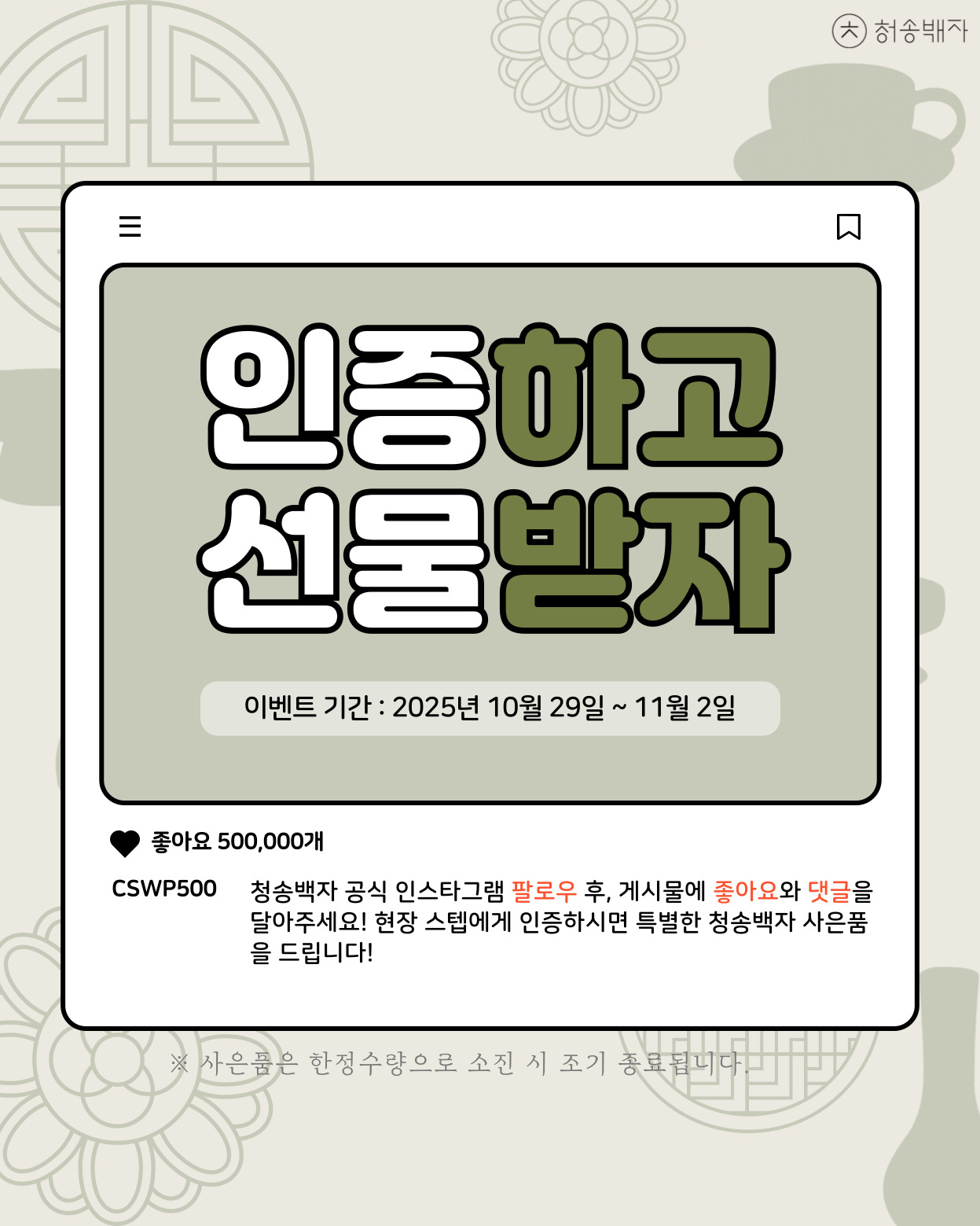 ※ 인증샷 이벤트 증정 사은품은 한정수량으로 소진 시 조기 종료 됩니다.